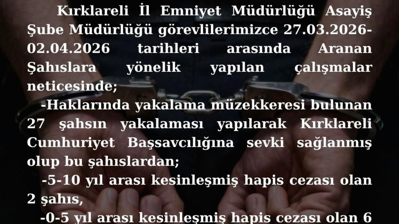 Edinilen bilgiye göre, 27 Mart-2 Nisan tarihleri arasında gerçekleştirilen çalışmalarda haklarında yakalama müzekkeresi bulunan şahısların yakalanmasına yönelik geniş çaplı operasyon düzenlendi. Yapılan çalışmalar neticesinde toplam 27 kişi yakalandı. Emniyetteki işlemlerinin ardından adliyeye sevk edilen şahıslardan 5-10 yıl arası kesinleşmiş hapis cezası bulunan 2 kişi ile 0-5 yıl arası kesinleşmiş hapis cezası bulunan 6 kişi olmak üzere toplam 8 kişi tutuklanarak ceza infaz kurumlarına teslim edildi. Diğer 19 şahıs ise ifadelerinin alınmasının ardından serbest bırakıldı.