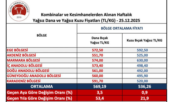UKON’un 25 Aralık 2025 tarihli haftalık bültenine göre, yağsız dana bıçak eti Türkiye genelinde kilogram başına 569,19 TL, kuzu bıçak eti ise 536,26 TL seviyesine ulaştı. Dana fiyatı bir önceki aya göre yüzde 3,5, yıllık bazda ise yüzde 53,4 artış gösterdi. Kuzu fiyatı da sırasıyla yüzde 0,9 ve yüzde 21,9 oranında yükseldi.