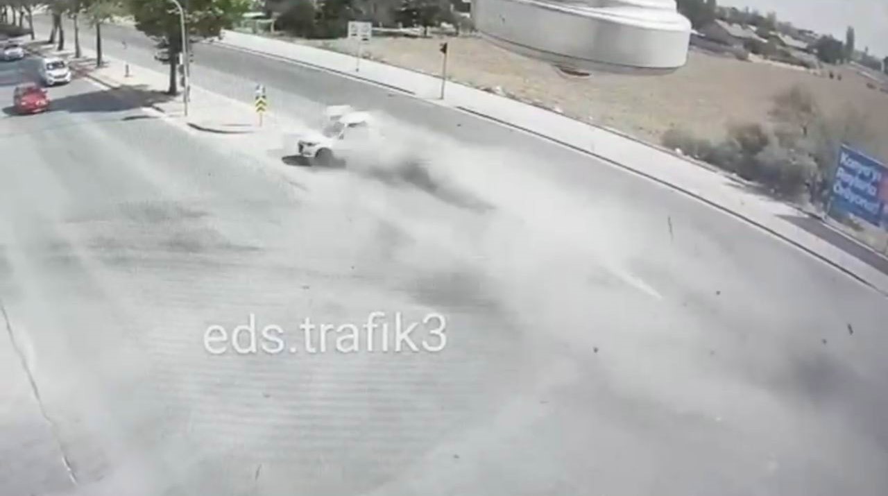Konya’da kırmızı ışıkta bekleyen otomobilin, son sürat gelen başka bir otomobilin çarpması sonucu direğe ve ağaca çarpıp ikiye bölündüğü ve sürücüsünün hayatını kaybettiği kaza güvenlik kamerasına saniye san