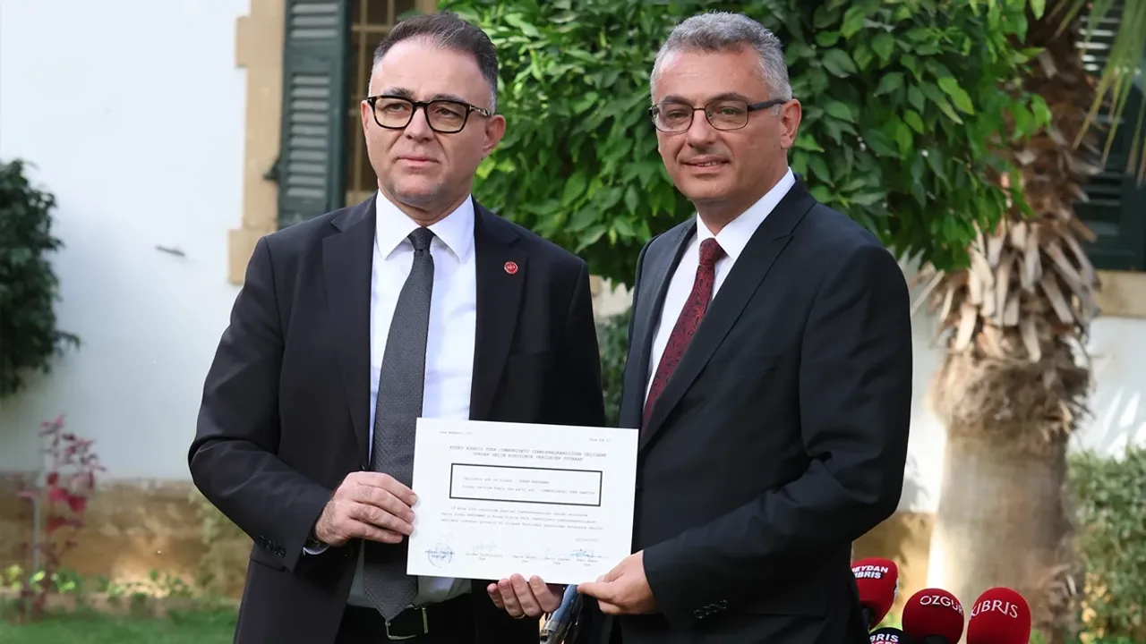 KKTC Yüksek Mahkeme Binası bahçesinde düzenlenen törende, KKTC Cumhurbaşkanı seçilen Tufan Erhürman'a mazbatasını, Yüksek Mahkeme Başkanı ve aynı zamanda Yüksek Seçim Kurulu (YSK) Başkanı olan Bertan Özerdağ verdi.