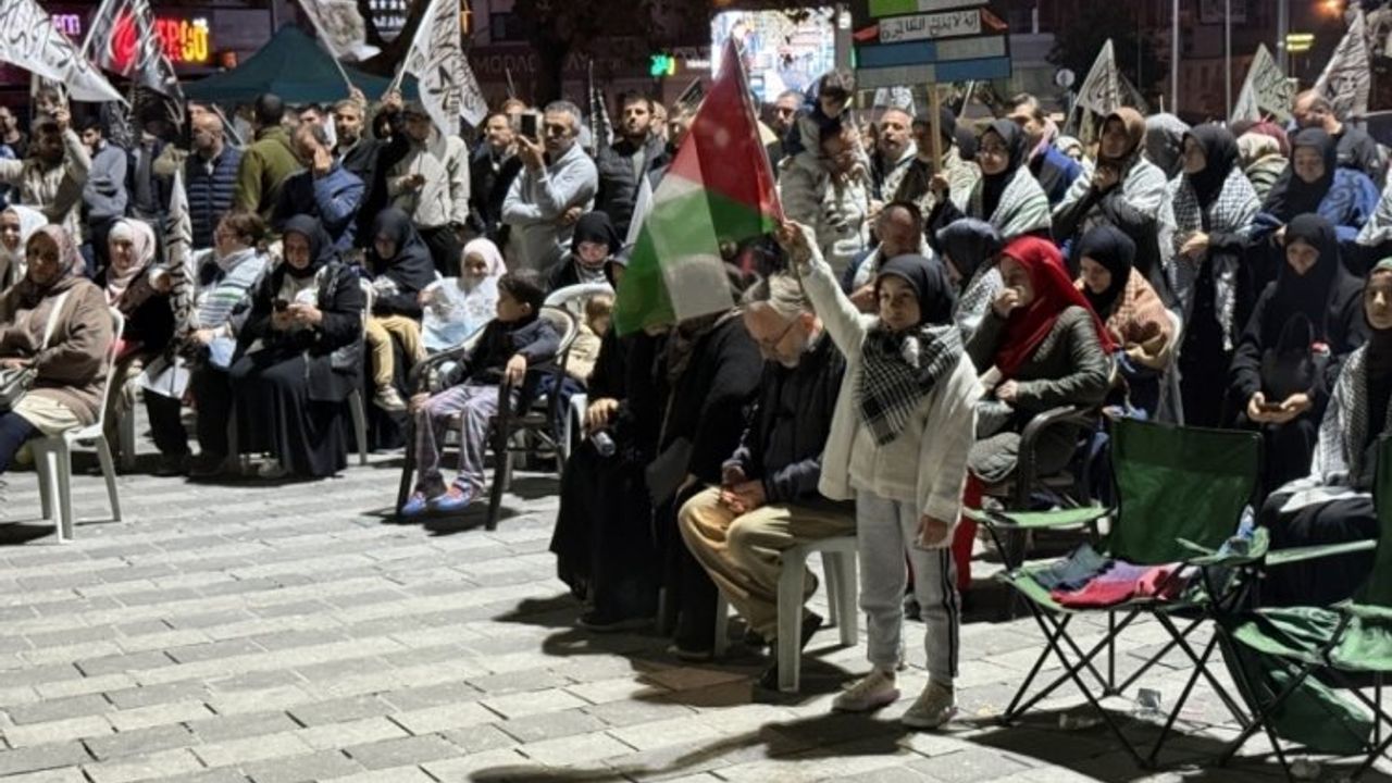 Bursa'da 15 Temmuz Demokrasi Meydanı'nda toplanan çok sayıda kişi, İsrail aleyhine slogan atarak, Küresel Sumud Filosu'na yapılan saldırılara tepkisini ortaya koydu.
