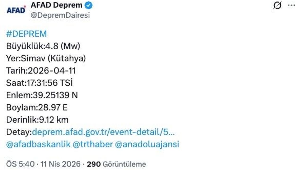 AFAD verilerine göre, saat 17.31'de Kütahya'nın Simav ilçesi merkezli 4.8 büyüklüğünde deprem meydana geldi. 4.8 büyüklüğündeki deprem Bursa ve ilçelerinden de hissedildi.