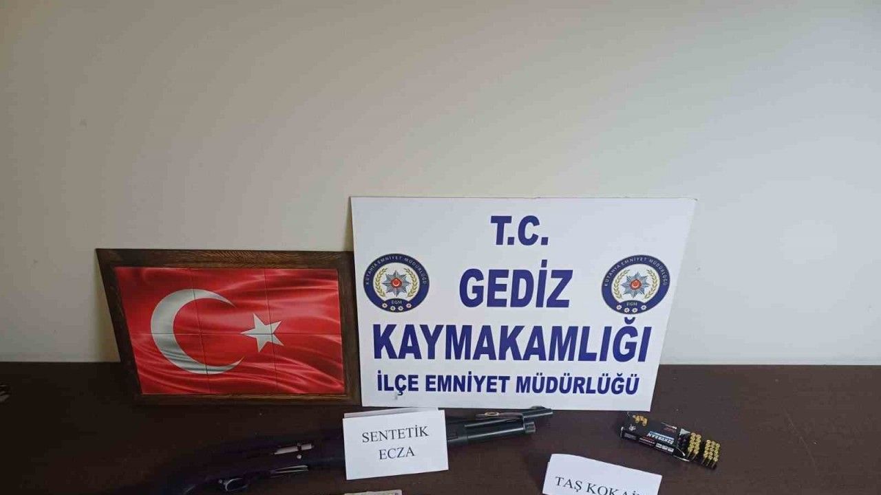 Yürütülen soruşturma kapsamında il dışından Kütahya’ya uyuşturucu madde getireceği tespit edilen şahısların bulunduğu araç, Gediz ilçesi sınırlarında durduruldu. Araçta bulunan S.G. (24), A.S. (32), R.Ç. (36) ve Ö.Ç. (67) yakalanarak gözaltına alındı. Şüphelilerin üzerlerinde, araçlarında ve ikametlerinde yapılan aramalarda; 528 adet sentetik ecza, 2 parça halinde 8 gram taş kokain, 4 gram eroin, 11 adet kenevir tohumu, 1 adet esrar öğütücü, 1 adet hassas terazi, 1 adet ruhsatsız av tüfeği ve 25 adet fişek ele geçirildi.