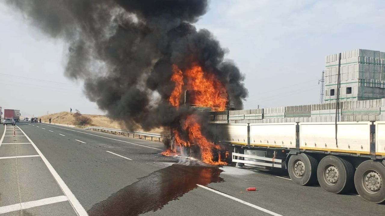 Malatya-Elazığ Karayolu Kale ilçesi mevkiinde inşaat malzemesi yüklü bir tırda çıkan yangın, itfaiye ekiplerince söndürüldü.