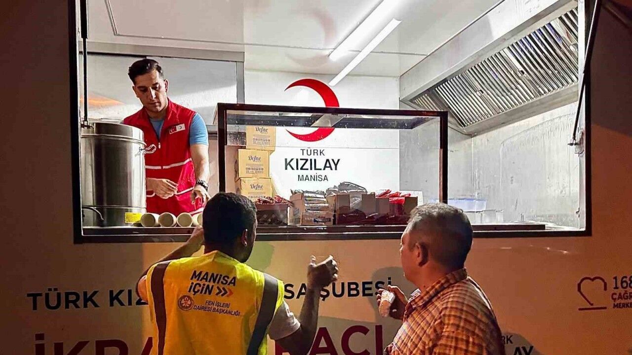 Türk Kızılay Manisa İl Merkezi ekipleri, Manisa-Uşak sınırında orman yangınıyla mücadele eden ekiplerle yemek, çay, ayran, su ve çeşitli ikramlarda bulundu.