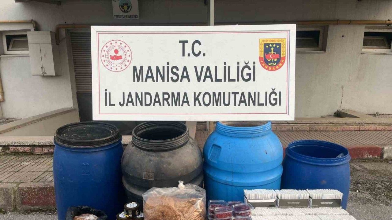 Manisa’nın Turgutlu ilçesinde jandarma ekiplerince düzenlenen operasyonda 640 litre şarap, 10 bin 620 adet içi tütün doldurulmuş makaron sigara ve nargile tütünü ele geçirildi.