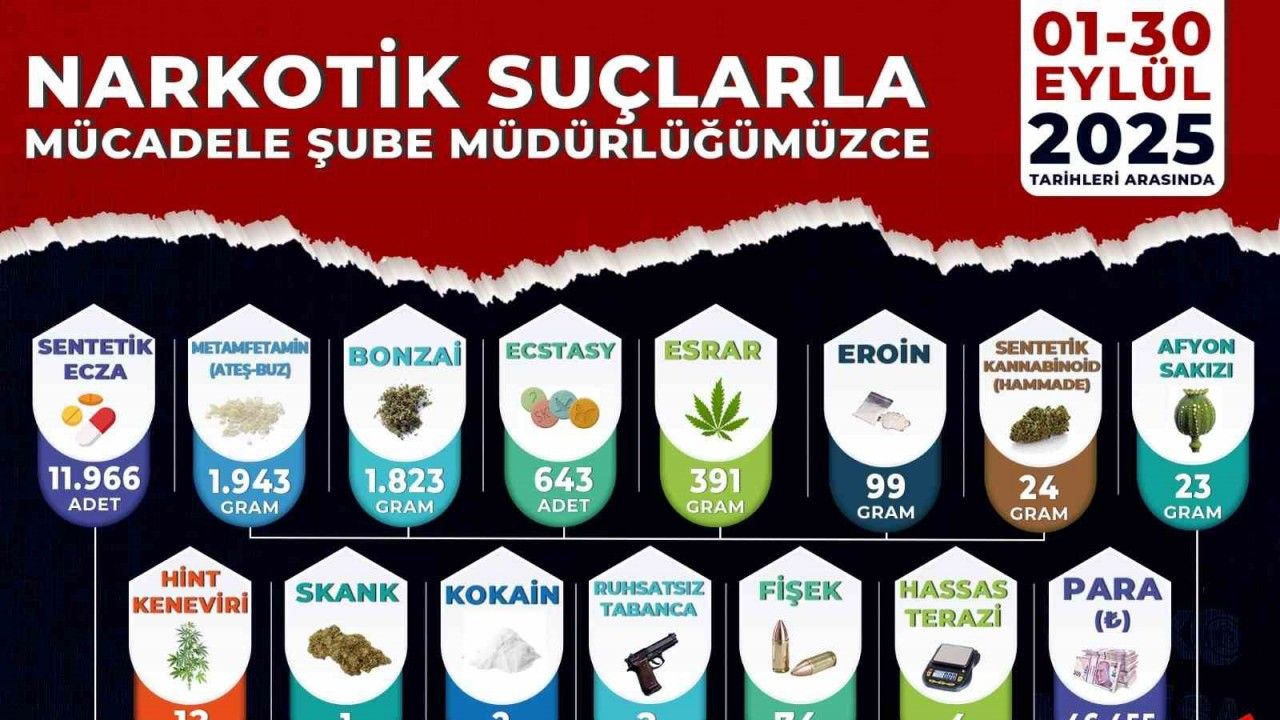 Manisa İl Emniyet Müdürlüğü Narkotik Suçlarla Mücadele Şube Müdürlüğü koordinesinde, Akhisar, Alaşehir, Salihli, Soma ve Turgutlu NSM Büro Amirliklerinin desteğiyle 1-30 Eylül 2025 tarihleri arasında yürütülen çalışmalar sonucunda 387 olay meydana gelirken, 477 şüpheli yakalandı. Şüphelilerden 56’sı tutuklanırken, 72 aranan şahıs da yakalandı. Yapılan operasyonlarda; 11 bin 966 sentetik ecza (hap), bin 943 gram metamfetamin, bin 823 gram sentetik kannabinoid (bonzai), 643 ecstasy hap, 391 gram esrar, 99 gram eroin, 24 gram sentetik kannabinoid hammaddesi, 23 gram afyon sakızı, 12 kök hint keneviri, 1 gram skank, 2 gram kokain, 2 ruhsatsız tabanca, 74 fişek, 4 hassas terazi ve uyuşturucu madde ticaretinden elde edildiği değerlendirilen 46 bin 455 TL para ele geçirildi.
