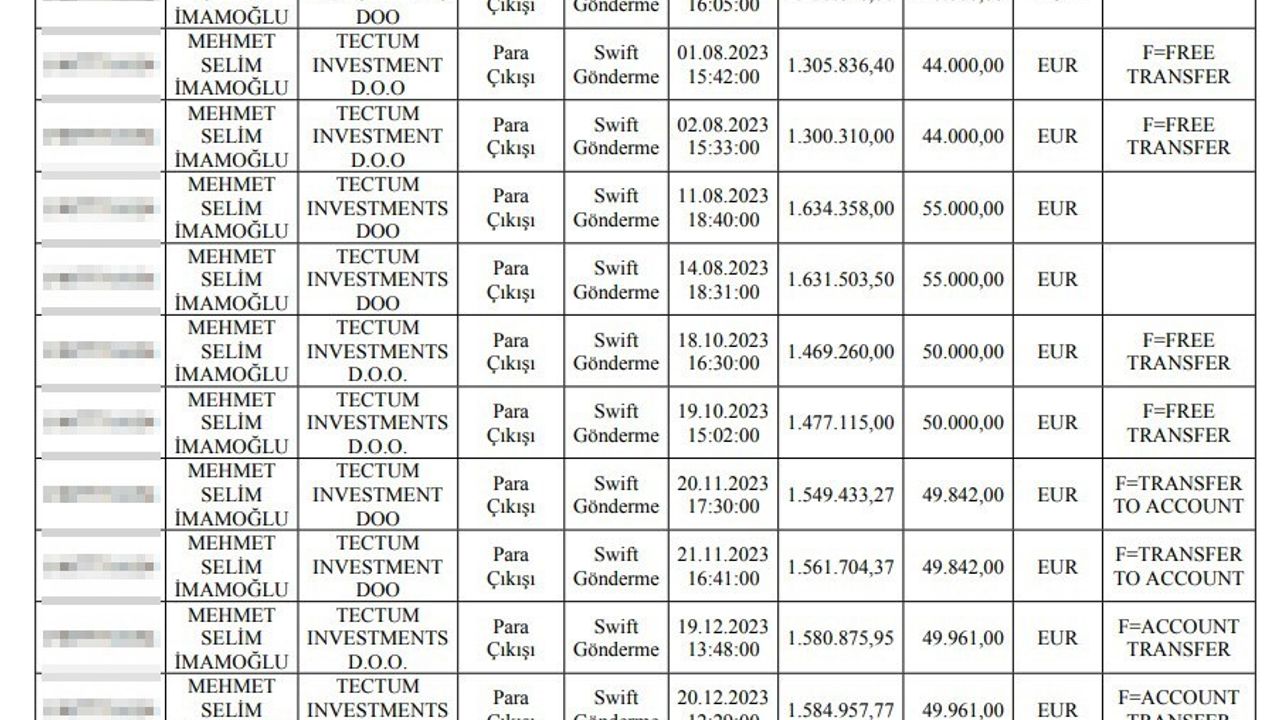 Rapora göre, İmamoğlu’nun oğlu Mehmet Selim İmamoğlu’nun ‘Tectum Investment D.O.O.’ adlı Hırvatistan’daki bir şirkete 2023 ve 2024 yıllarında toplam 637 bin 106 Euro tutarında gönderme işlemi gerçekleştirdiği, Hırvatistan’da yerleşik olan bu şirketin Mehmet Selim İmamoğlu’na ait olduğu aktarıldı.