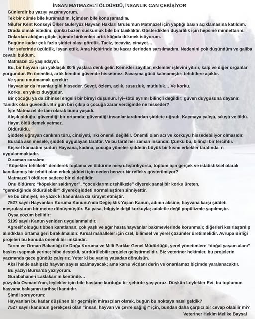 Ankara’da 15 yaşındaki sokak köpeği Matmazel’in şiddet sonucu öldürülmesi, kamuoyunda derin yankı uyandırırken Veteriner Hekimler Odası Başkanı Melike Baysal’ın kaleme aldığı yazı, yaşananlara dair vicdanları sarsan bir tanıklık niteliği taşıdı.