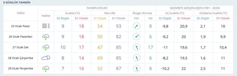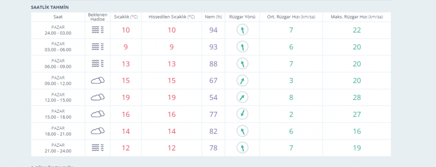 Günün en yüksek sıcaklığı 12.00-15.00 aralığında 19 derece olarak ölçülürken, bu saatlerde hava çok bulutlu olacak. Nem oranı ise öğle saatlerinde yüzde 54 seviyelerine kadar gerileyecek. Öğleden sonra ise sıcaklık yeniden düşüşe geçiyor.