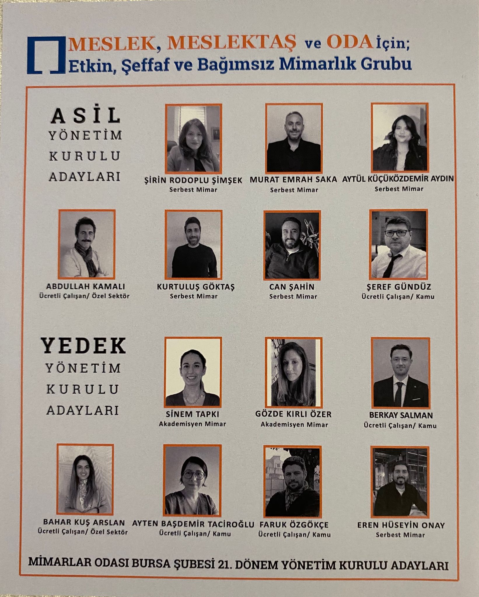 Şimşek, “Önceki dönemlerde edindiğimiz deneyim, birikim ve ortak üretim kültürünü geliştirerek daha ileri taşımak; etkin, şeffaf ve bağımsız Oda anlayışını güçlendirerek Mimarlar Odası Bursa Şubesi 21. Dönem Yönetim Kurulu’na yeniden aday olduğumuzu kamuoyuyla paylaşıyoruz” dedi.