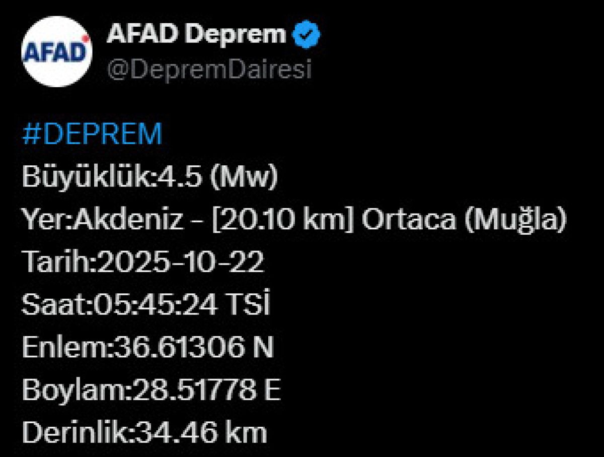 Afet ve Acil Durum Yönetimi Başkanlığının (AFAD) açıkladığı verilere göre Muğla'nın Ortaca ilçesinde 4.5 büyüklüğünde deprem meydana geldi.
