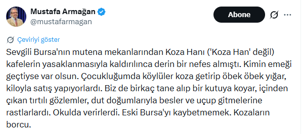 “Eski Bursa’yı özledim. Kozaların kokusunu…” sözleriyle paylaşımını tamamlayan Armağan’ın mesajı, sosyal medyada nostalji ve şehir kimliği tartışmalarını da beraberinde getirdi.