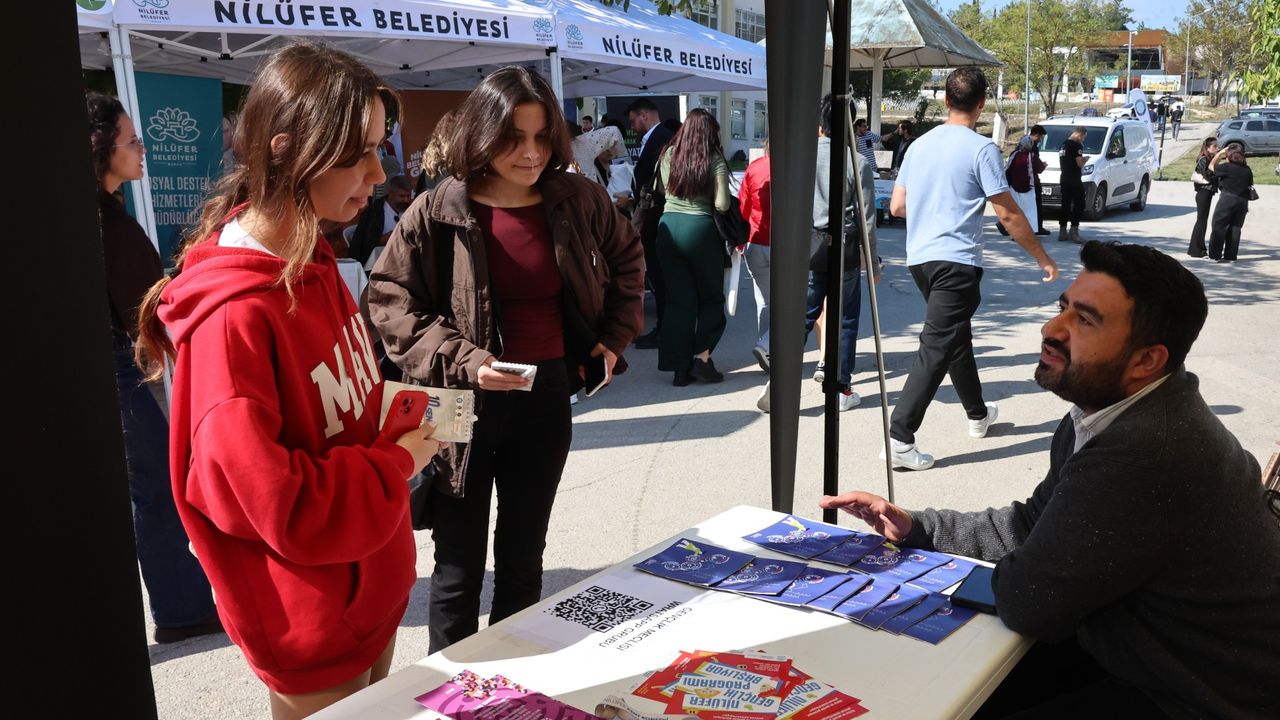 Bursa Uludağ Üniversitesi Mediko Sosyal ve Gençlik Danışma Merkezi önündeki alanda kurulan çadırda bulunan Nilüfer Belediyesi ve Nilüfer Kent Konseyi (NKK) ekipleri, yaptığı faaliyetleri ve öğrencilerin faydalanabileceği imkanları, materyallerle aktarıyor.