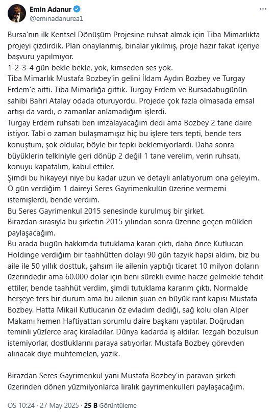 Bir dönem Bursaspor Başkanlığı da yapan müteahhit Emin Adanur, geçmişte yaptığı sosyal medya paylaşımlarında eski Nilüfer Belediye Başkanı Turgay Erdem hakkında çeşitli iddialarda bulunmuştu.