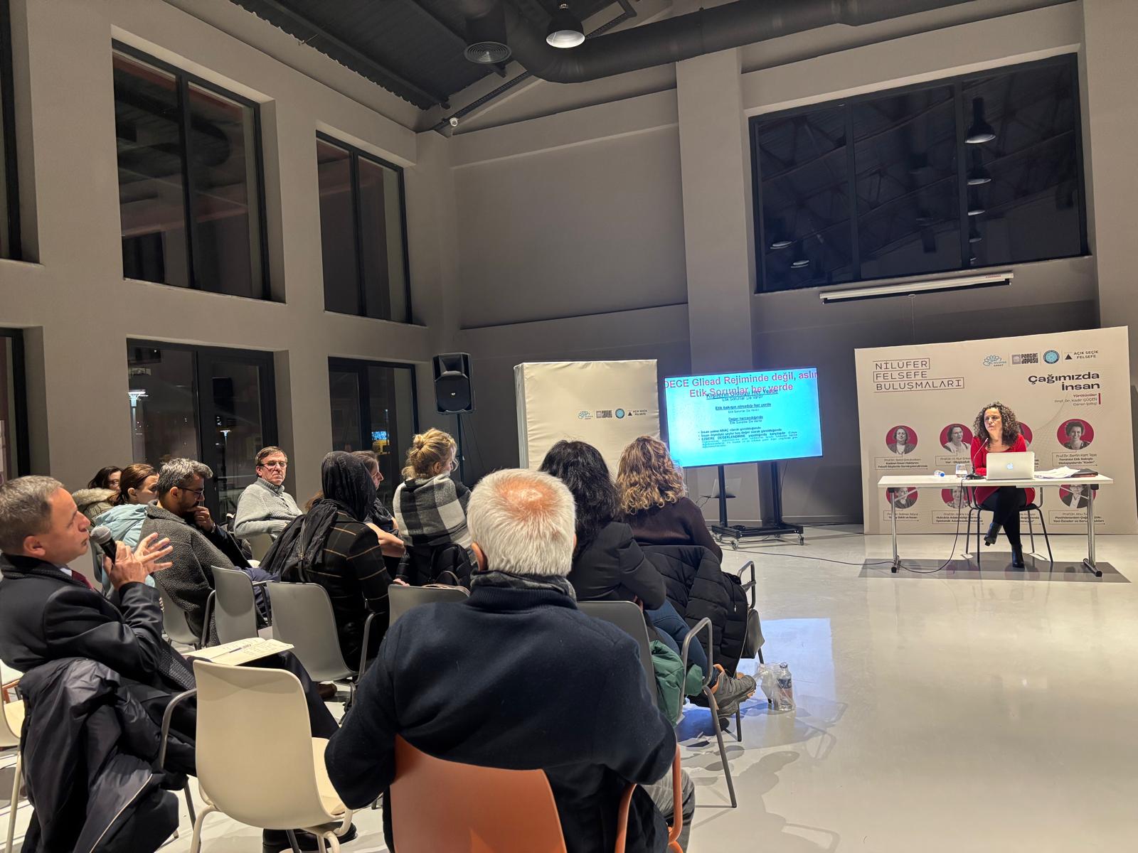 Nilüfer Belediyesi'nin düzenlediği "Nilüfer Felsefe Buluşmaları"na Prof. Dr. Berfin Kart Tepe konuk oldu. Pancar Deposu'nda gerçekleştirilen Ocak ayı söyleşisinde, "Feminist Etik Bakışla Distopyalarda Kadın" başlığı ele alındı.
