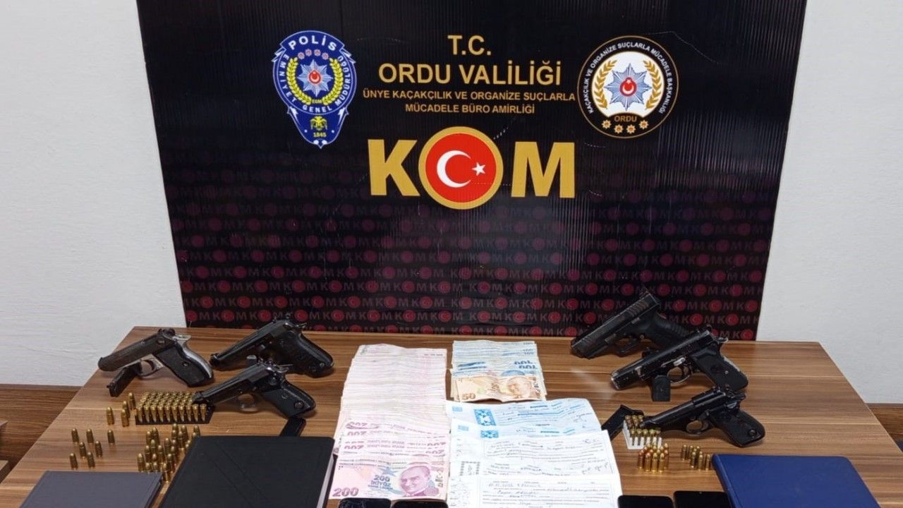 Ünye Cumhuriyet Başsavcılığı koordinesinde, İl Emniyet Müdürlüğü Kaçakçılık ve Organize Suçlarla Mücadele Şube Müdürlüğü tarafından tefecilik suçuna yönelik yürütülen çalışmalar kapsamında, Ünye ilçesinde 8 adrese yönelik operasyon gerçekleştirildi. Operasyonlarda, 6 adet ruhsatsız tabanca, 42 bin 100 TL para, 120 adet fişek, çok sayıda senet ve alacak verecek defteri ele geçirildi.
