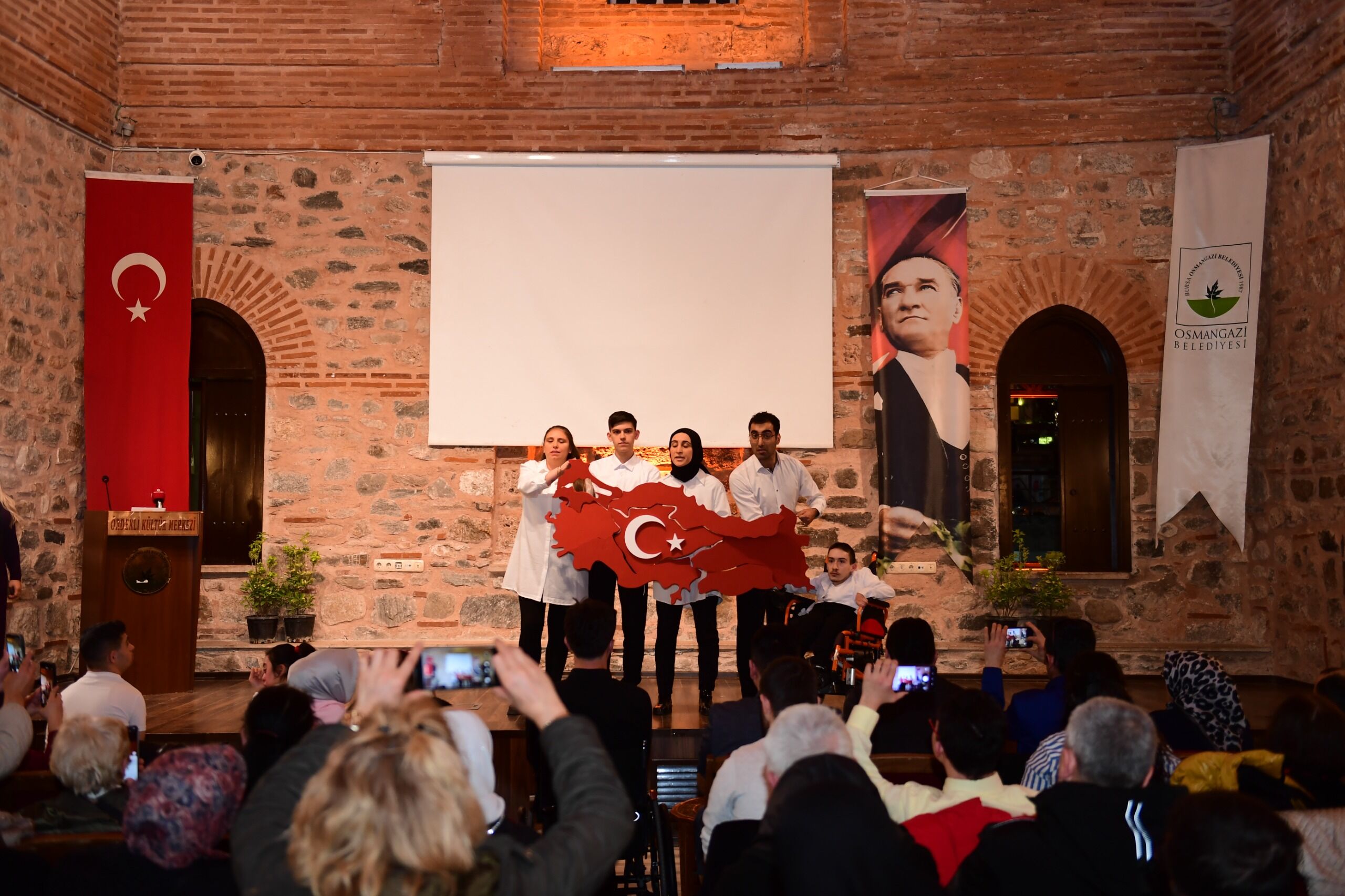 Engelli bireylerin sosyal hayata daha aktif katılımını sağlama amacıyla çalışmalarını yoğun bir şekilde sürdüren Osmangazi Belediyesi, Osmangazi Kent Konseyi Engelliler Meclisi ile anlam dolu bir etkinliğe imza attı. İstiklal Marşı'nın Kabulü’nün 105. yıl dönümü ile Çanakkale Zaferi’nin 111. yıl dönümü dolayısıyla Ördekli Kültür Merkezi’nde düzenlenen programda engelli çocuklar ve bireyler sahne alarak izleyenlere unutulmaz anlar yaşattı. Milli birlik ve beraberlik ruhunun güçlü bir şekilde hissedildiği etkinlikte engelli çocuklar, özel olarak hazırladıkları anlamlı gösteriyle büyük beğeni topladı. Program kapsamında çocuklar, ellerinde taşıdıkları ay ve yıldız figürleriyle Türk bayrağını sembolize eden koreografik bir gösteri sergiledi. Sahnedeki görüntüler izleyenlere hem gurur hem de duygu dolu anlar yaşatırken, salonu dolduran vatandaşlar çocukları uzun süre alkışladı. Etkinlikte aynı zamanda tarih ve vefa duygusunun güçlü bir anlatımı da sahnelendi. Engelli bireyler tarafından hazırlanan ve Çanakkale Zaferi’nin ruhunu yansıtan piyes, izleyicilerden tam not aldı. Piyeste, vatan uğruna verilen mücadele, fedakarlık ve kahramanlık duyguları etkileyici bir şekilde anlatıldı. Program, müzik dinletileriyle devam etti. İbrahim Parlak ve Berfin Özdal, seslendirdikleri türkülerle izleyenlerin yüreğine dokundu. Duygu dolu eserler eşliğinde salonu kaplayan atmosfer, milli değerlerin ve dayanışma ruhunun en güzel örneklerinden birini ortaya koydu.
