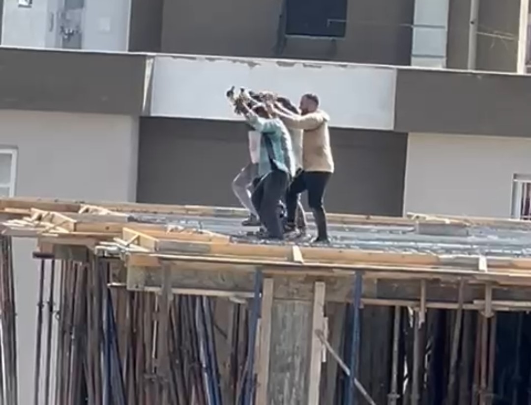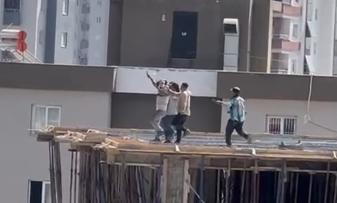 Adana’da bir inşaatın 10’uncu katında çalışan işçiler otomobilden gelen müzik sesiyle birlikte oldukları yerde halay çekmeye başladı.