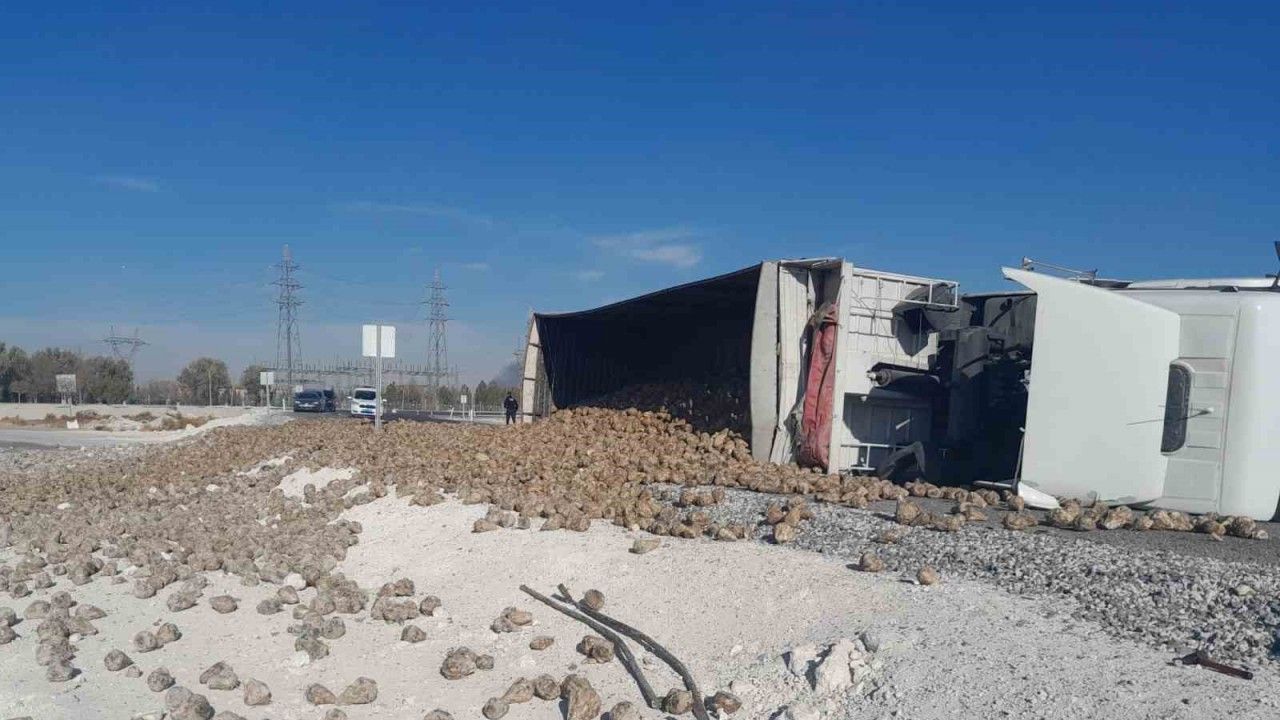 Konya’nın Karapınar ilçesinde devrilen pancar yüklü tırın sürücüsü yaralandı.