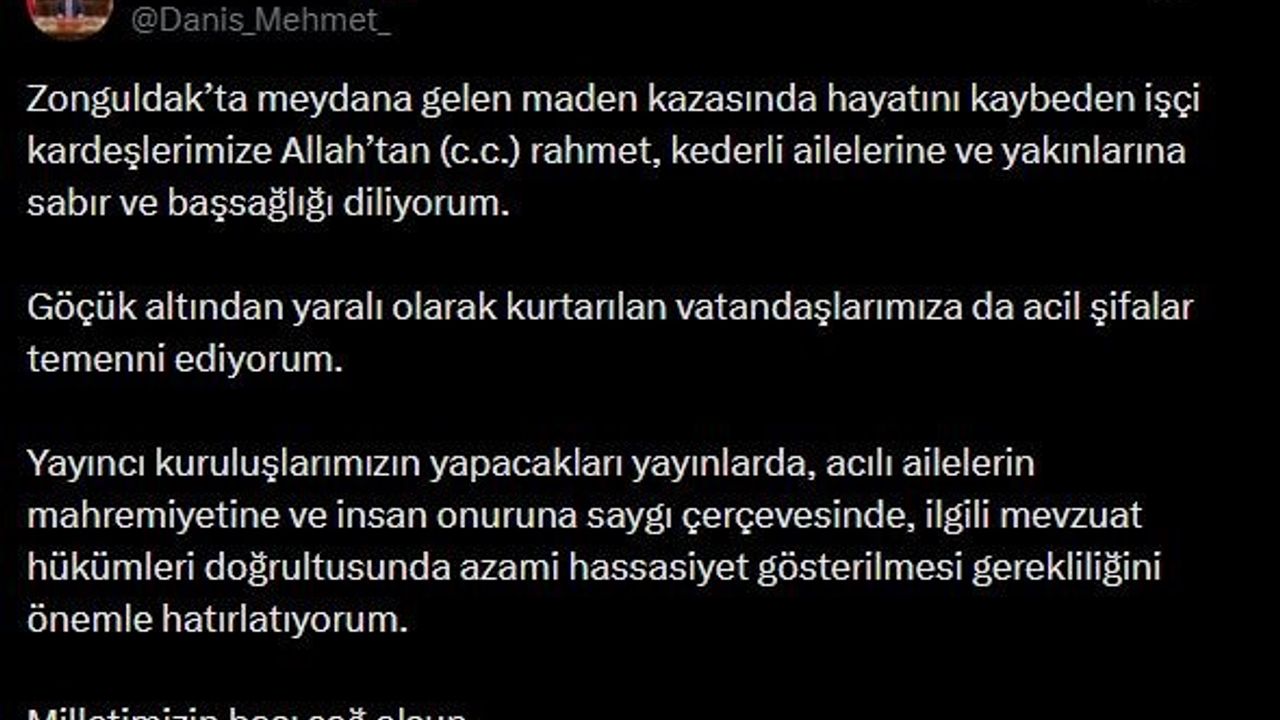 Radyo ve Televizyon Üst Kurulu (RTÜK) Başkanı Mehmet Daniş, sosyal medya hesabından yaptığı paylaşımda, Zonguldak'ta meydana gelen maden kazasında hayatını kaybeden işçilere Allah'tan rahmet, kederli ailelerine ve yakınlarına sabır ve başsağlığı diledi.