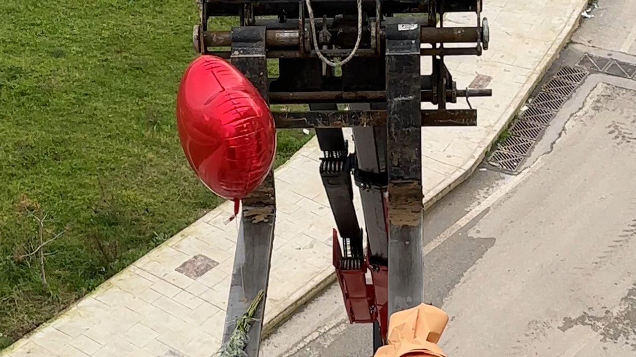 14 Şubat Sevgililer Günü’nü unutan kepçe operatörü Sefa Kurt, eşinin gönlünü almak için manitou denilen iş makinesinin ucuna bağladığı gül buketi ve balonu evlerinin balkonuna uzattı.