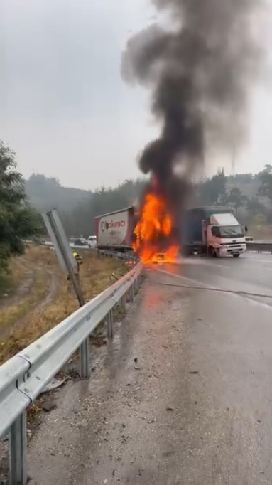 Bursa’dan Yalova yönüne gitmekte olan tırın motor bölümünde henüz bilinmeyen bir nedenle yangın çıktı.