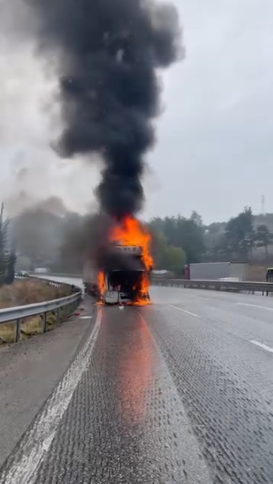 Yangın itfaiye ekipleri tarafından söndürülürken, alevlere teslim olan tırın bir kısmı yanarak kullanılamaz hale geldi.