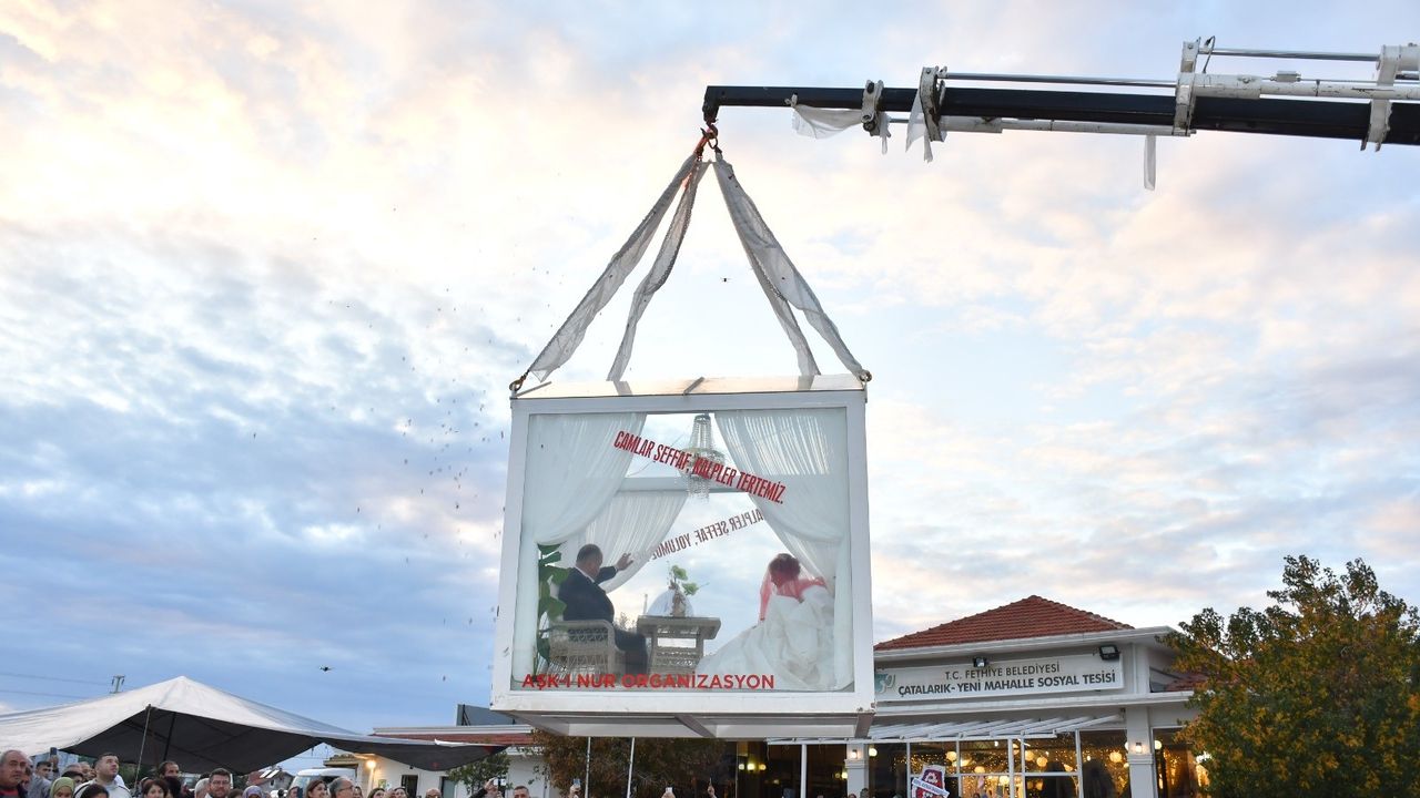 Fethiye ve Seydikemer ilçelerinin siyaset, esnaf ve ticaret dünyasından yoğun katılımın olduğu düğün töreninde gelin almaya özel yaptırılıp tıra yüklenen cam vitrin ile gidildi. Cam vitrin kız evinde vinçle tırdan indirilirken, gelin Merve Sarıman ve damat Berat Çetinkaya dualarla cam vitrine girdi. Cam vitrin vinçle tekrar tıra alkışlar arasında yüklendi. Gelini alan damat tarafları konvoy eşliğinde Seydikemer ilçesinden Fethiye'ye hareket etti. Tırda gelin ve damadı cam vitrinde görenler bu anı cep telefonlarıyla görüntülemeye çalıştı. Tır üzerinde cam vitrin içinde Çatalarık Mahallesi sosyal tesislerine çift geldiğinde çok sayıda davetli alkış tuttu. Cam vitrin içindeki çift burada da vinç yardımıyla tırdan yine alkışlar arasında indirildi.