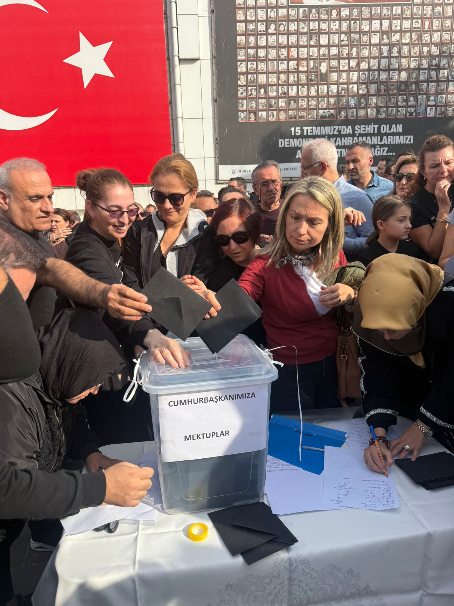 Ellerinde “TMSF tapularımız sana emanet” yazılı dövizler taşıyan vatandaşlar, Cumhurbaşkanı Recep Tayyip Erdoğan’a hitaben yazdıkları mektupları siyah zarflar içinde toplayarak AK Parti Bursa İl Başkanlığı’na teslim etti.