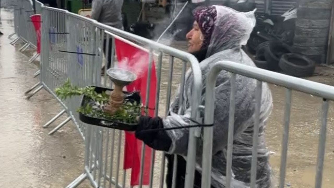 Hatay'da CHP Genel Başkanı Özgür Özel'in mitinginde tütsü yakan yaşlı kadının slogan atarken üzerine kömürü düşerek yanma tehlikesi geçirdiği anlar kameraya yansıdı. Çevredekilerin 'abla yanıyorsun' söylemlerine aldırış etmeyen kadının montu ve eli zarar gördü.