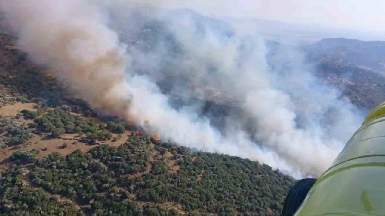 Aydın’ın Söke ilçesinde yerleşim yerlerine yakın bölgedeki zeytinlik alanda çıkan orman yangına karadan ve havadan müdahale yoğun şekilde sürüyor.