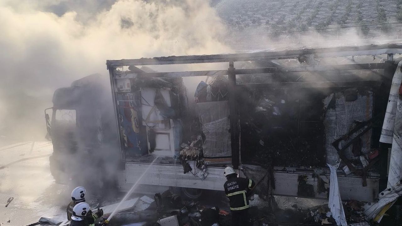 Hatay'da sınır kapısından Suriye'ye geçmek için bekleyen eşya yüklü park halindeki tır, alevlere teslim olarak yandı.