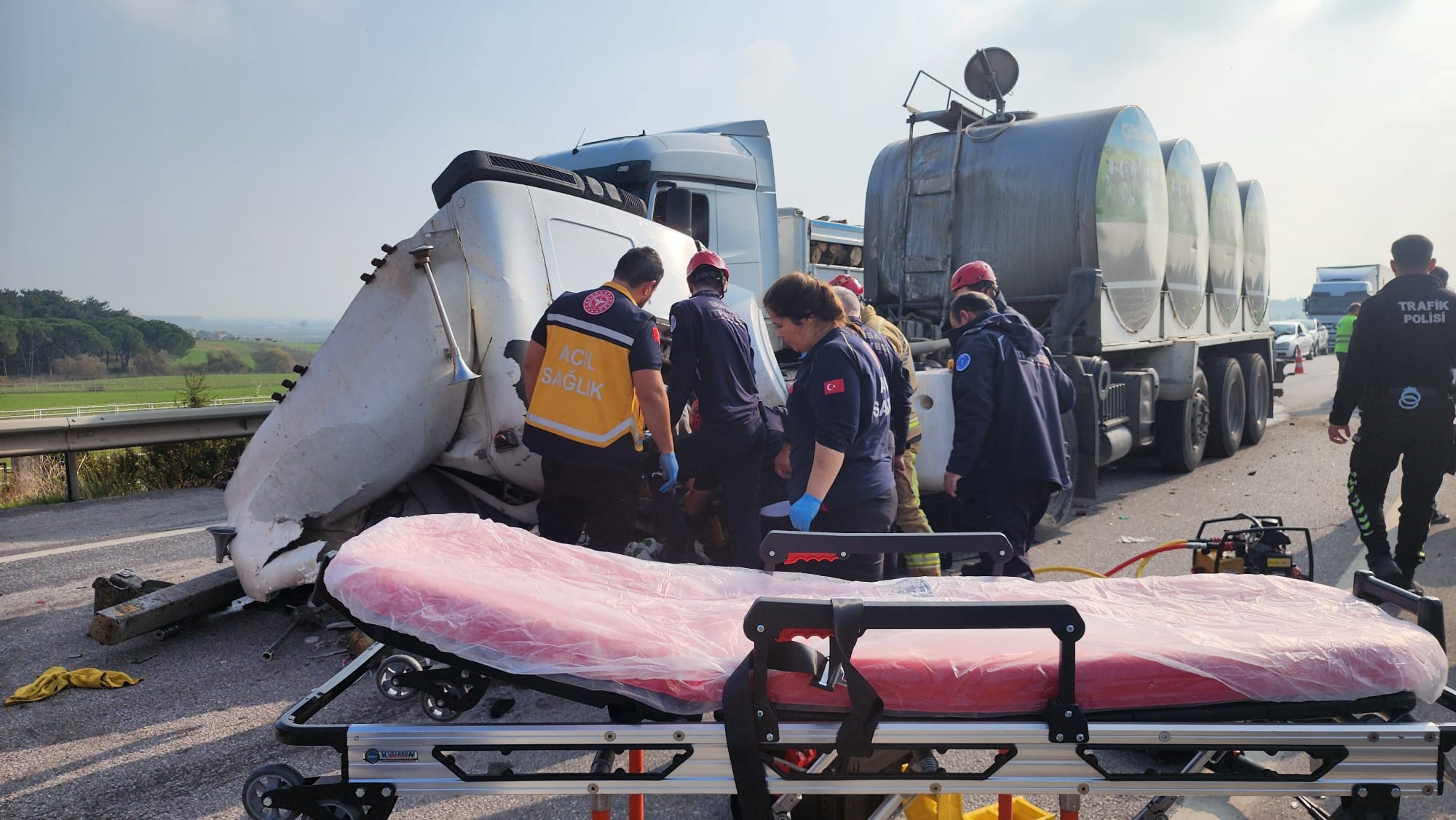 Kaza, Bursa-İzmir kara yolu Mustafakemalpaşa-Karacabey arasında meydana geldi. Edinilen bilgiye göre, 16 TE 580 plakalı süt tankeri, aynı yöndeki 16 BML 374 plakalı tıra arkadan çarptı. Kazada süt tankeri sürücüsü M.B., aracın kabininde sıkıştı.