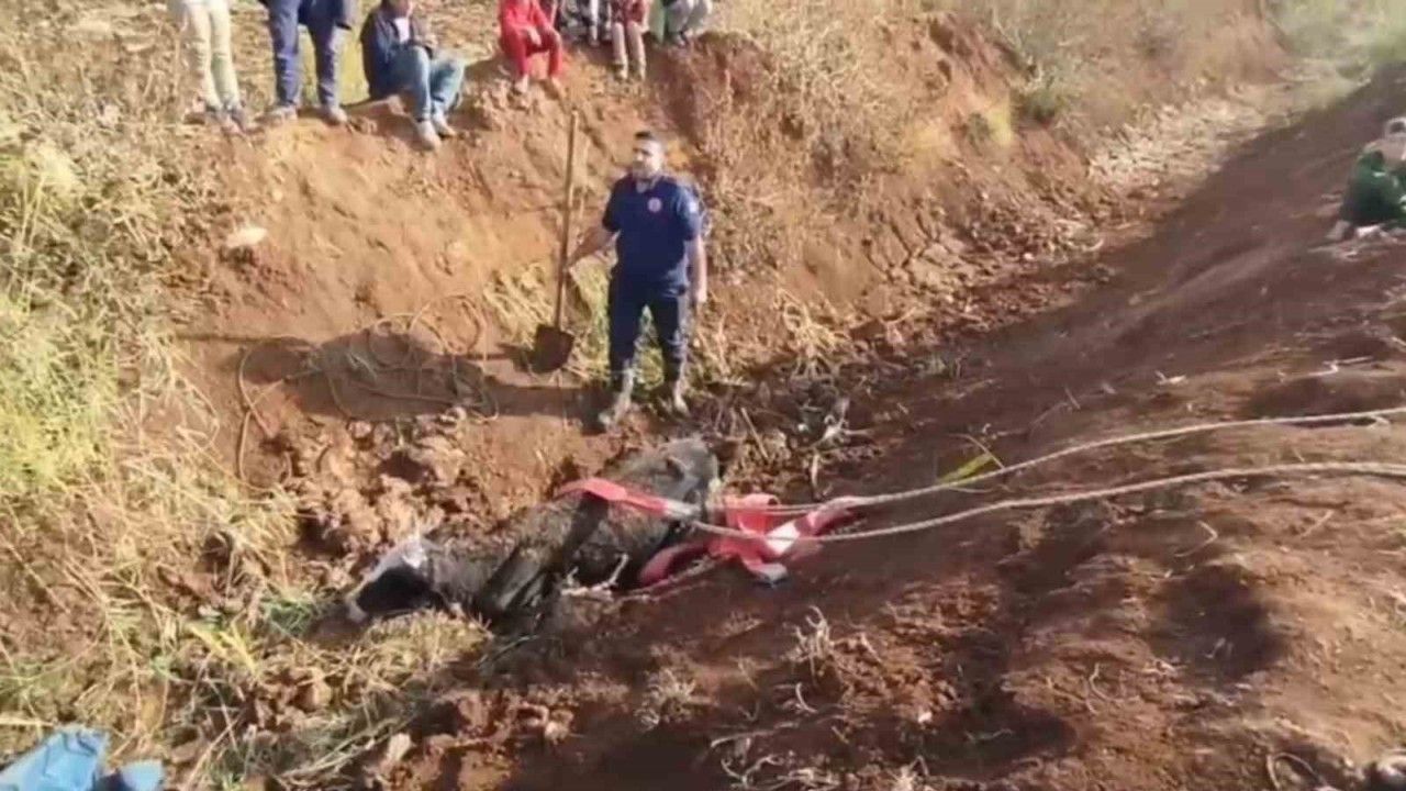 Şanlıurfa’nın Eyyübiye ilçesinde, tahliye kanalına düşen inek, itfaiye ekiplerince kurtarıldı.