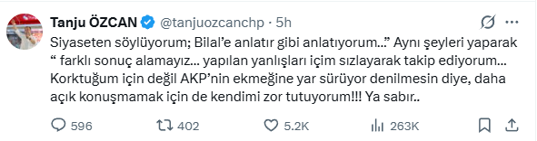 Bolu Belediye Başkanı Tanju Özcan, sosyal medya hesabından yaptığı açıklamada "yapılan yanlışları içim sızlayarak takip ediyorum" dedi. "AKP'nin ekmeğine yağ sürüyor denilmesin diye, daha açık konuşmamak için de kendimi zor tutuyorum" ifadelerini kullandı.