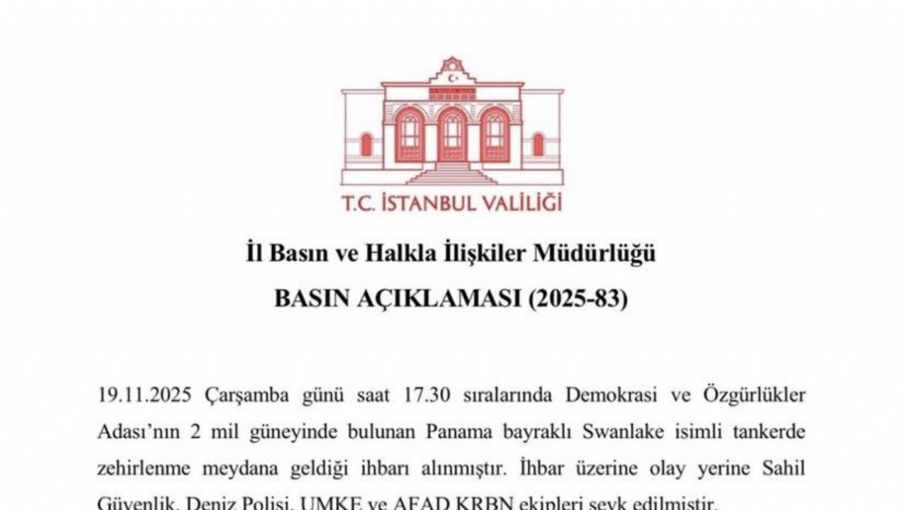 İstanbul Valiliği tarafından yapılan açıklamada, "19 Kasım 2025 Çarşamba günü saat 17.30 sıralarında Demokrasi ve Özgürlükler Adası’nın 2 mil güneyinde bulunan Panama bayraklı Swanlake isimli tankerde zehirlenme meydana geldiği ihbarı alınmıştır. İhbar üzerine olay yerine Sahil Güvenlik, Deniz Polisi, UMKE ve AFAD KRBN ekipleri sevk edilmiştir. İlk belirlemelere göre tankerin soğuk tankında meydana gelen sızıntıdan kaynaklandığı düşünülen olayda 1 mürettebat hayatını kaybetmiş, 2 mürettebat ise zehirlenerek gözetim altına alınmıştır. Rusya vatandaşı toplam 13 mürettebatın bulunduğu gemideki diğer 10 mürettebat ve iki yaralının tahliye çalışmaları devam etmektedir" ifadeleri kullanıldı.