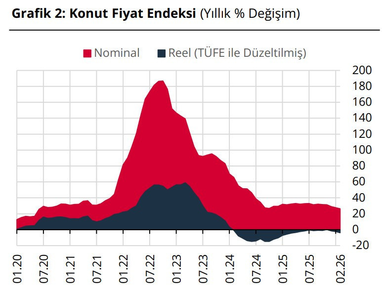 TCMB verilerine göre, 2026 yılı Şubat ayında bir önceki aya göre yüzde 1,8 oranında artan KFE, bir önceki yılın aynı ayına göre nominal olarak yüzde 26,4 oranında artarken, enflasyondan arındırılmış reel olarak ise yüzde 3,9 oranında azaldı.