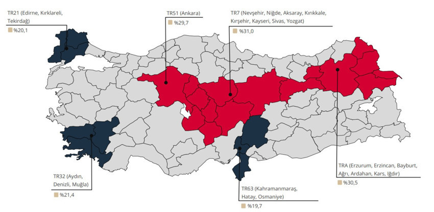İstatistiki Bölge Birimleri Sınıflamasına göre bölgelerin yıllık konut fiyat endeksi değişimleri incelendiğinde, Şubat 2026 döneminde en yüksek yıllık artış yüzde 31,0 ile Nevşehir, Niğde, Aksaray, Kırıkkale, Kırşehir, Kayseri, Sivas, Yozgat bölgesinde, en düşük yıllık artış ise yüzde 19,7 ile Hatay, Kahramanmaraş, Osmaniye bölgesinde oldu.