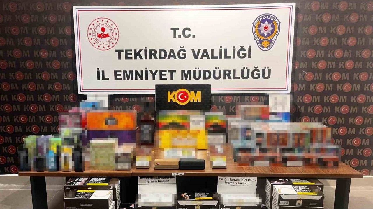 Tekirdağ İl Emniyet Müdürlüğü Kaçakçılık ve Organize Suçlarla Mücadele Şubesi tarafından yürütülen çalışmalarda 383 bin adet dolu ve boş makaron, 50 kilogram tütün, 3 adet sigara sarma makinesi, 1 bin 406 paket gümrük kaçağı sigara, 150 adet gümrük kaçağı puro, 200 adet elektronik sigara kartuşu, 178 adet elektronik sigara, 20 adet elektronik sigara likiti, 3 adet elektronik sigara filtresi, 4 adet ısıtmalı tütün cihazı, 1 bin 462 adet sigara sarma kağıdı ve 1 şişe el yapımı alkollü içki ele geçirildi. Operasyon kapsamında 12 şüpheli gözaltına alınırken, şahıslar hakkında 5607 sayılı kanuna muhalefetten yasal işlem başlatıldı.