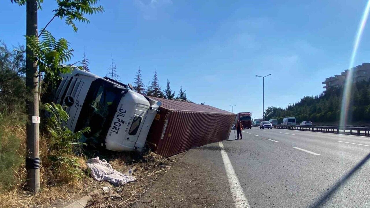 Kocaeli’nin İzmit ilçesi TEM otoyolu geçişinde konteyner yüklü tır devrildi. Sürücü kazayı hafif sıyrıklarla atlattı.