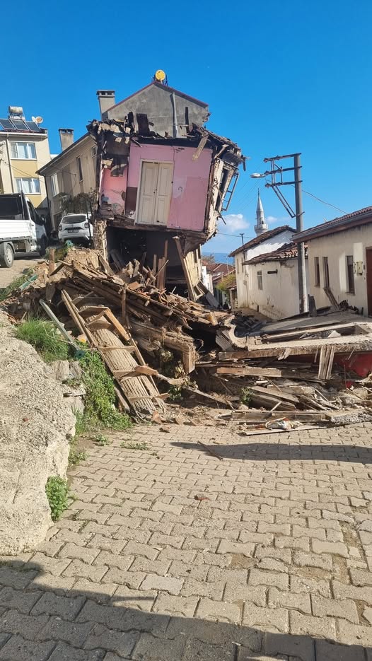 Bursa’nın Mudanya ilçesine bağlı tarihi ve turistik Tirilye Mahallesi’nde bulunan yaklaşık 200 yıllık “Tabut Ev” bugün öğle saatlerinde kendiliğinden yıkıldı.