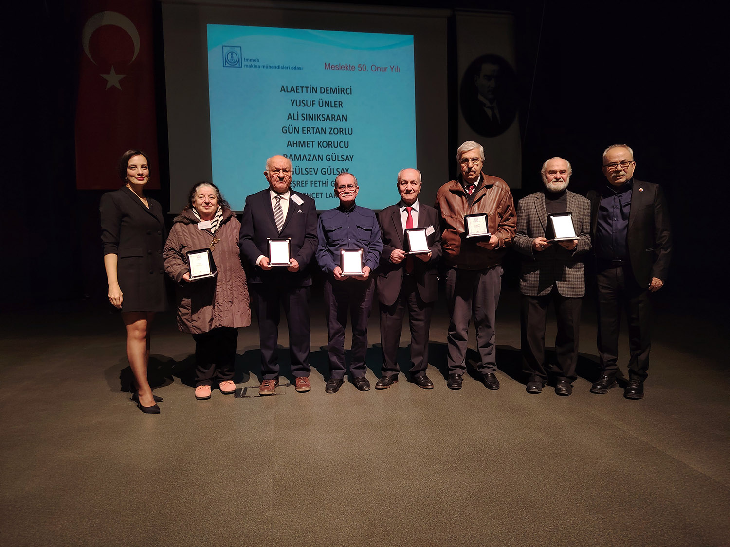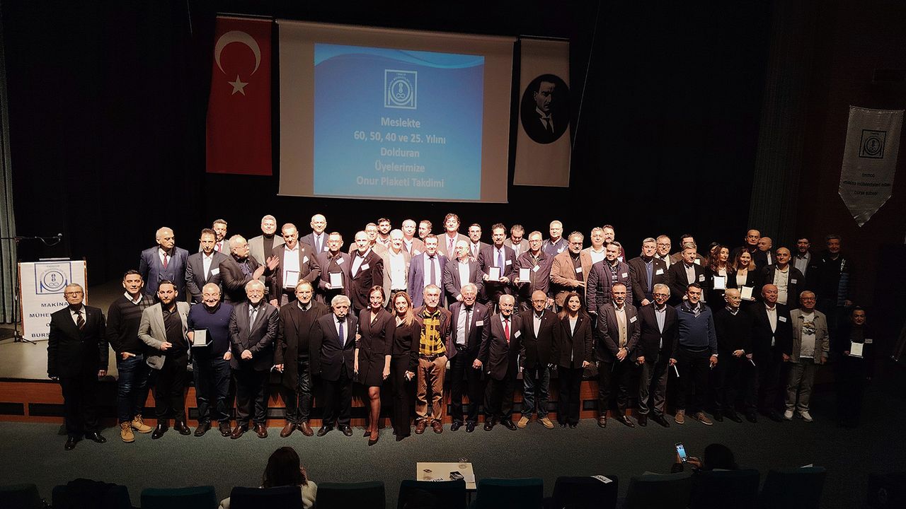 Oda etkinliği sebebiyle plaket töreninde bulunamayan Makina Mühendisleri Odası Yönetim Kurulu'nun mesajının okunmasının ardından meslekte 60., 50., 40. ve 25. yılını dolduran TMMOB Makina Mühendisleri Odası Bursa Şube Üyelerine Onur plaketleri takdim edildi.