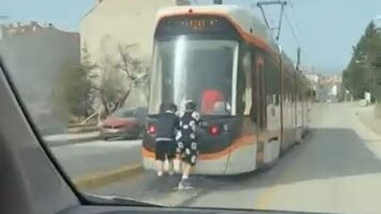 Eskişehir'de patenli 2 çocuğun tramvayın arkasına tutunarak yaptığı tehlikeli yolculuk kameraya yansıdı.