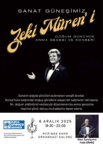 Bursa UNESCO Derneği’nin organizasyonuyla, Bursa Zeki Müren Güzel Sanatlar Lisesi’nin paydaşlığında düzenlenecek olan “Doğumunun 94. Yılında Zeki Müren’i Anma Gecesi Konseri”, 6 Aralık Cumartesi akşamı Merinos Atatürk Kongre ve Kültür Merkezi Orhangazi Salonu’nda gerçekleştirilecek.