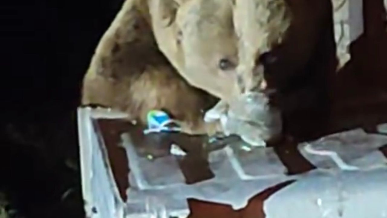 Turistik bölgede bir anda karşılarına ayı çıkan vatandaşlar, endişeli bakışlarla olan biteni izledi. Ayının çöp konteynerlerini tek tek devirerek yiyecek aradığı anlar cep telefonlarıyla saniye saniye kaydedildi.