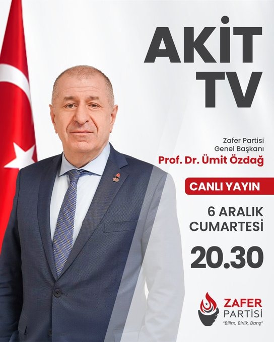 Zafer Partisi lideri Ümit Özdağ Akit TV'de Muharrem Coşkun’un sunduğu 'Kırmızı Oda' programında canlı yayına çıkacak.