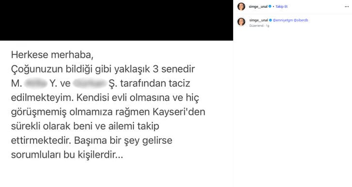"Çoğunuzun bildiği gibi yaklaşık 3 senedir M. A. Y. ve G. Ş. tarafından taciz edilmekteyim. Kendisi evli olmasına ve hiç görüşmemiş olmamıza rağmen Kayseri'den sürekli olarak beni ve ailemi takip ettirmektedir. Başıma bir şey gelirse sorumluları bu kişilerdir."