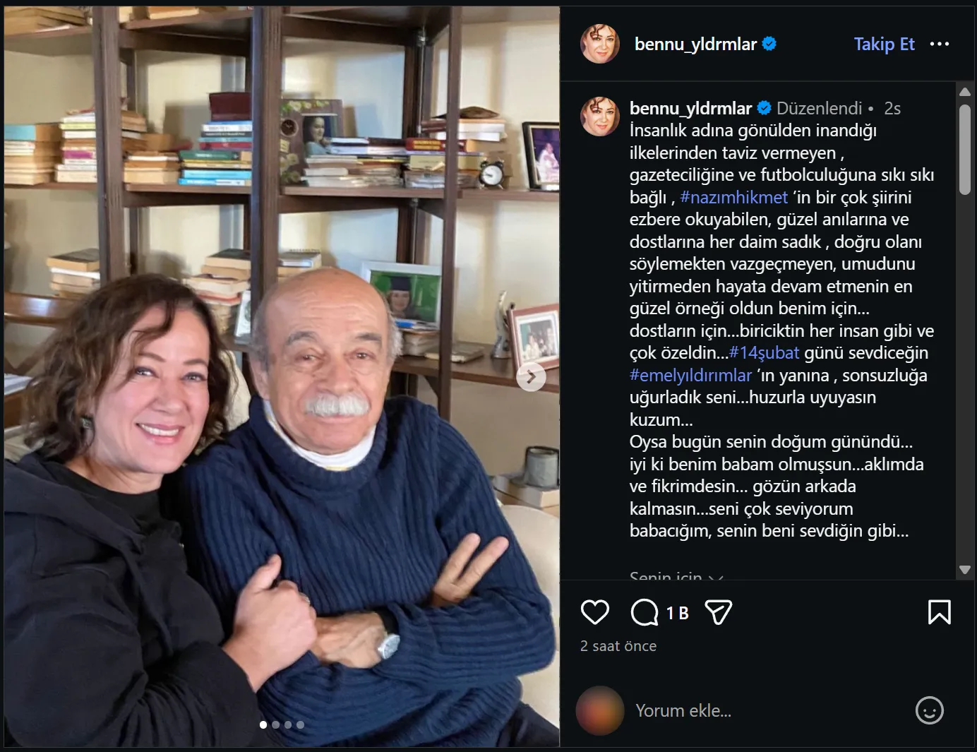 Oyuncu Bennu Yıldırımlar’ın babası Vedat Yıldırımlar yaşamını yitirdi. Yıldırımlar, babasının vefatını sosyal medyadan paylaştığı mesajla duyurdu.