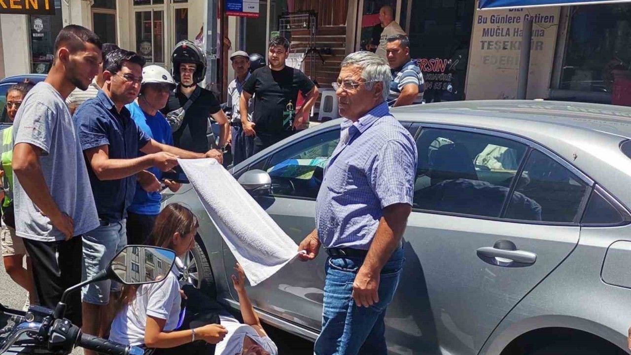 Muğla’nın Menteşe ilçesinde meydana gelen trafik kazasında yaralanan kadın motosiklet sürücüsü, çevredeki vatandaşlar tarafından sıcaktan korunması için havlu ile gölgelendi.